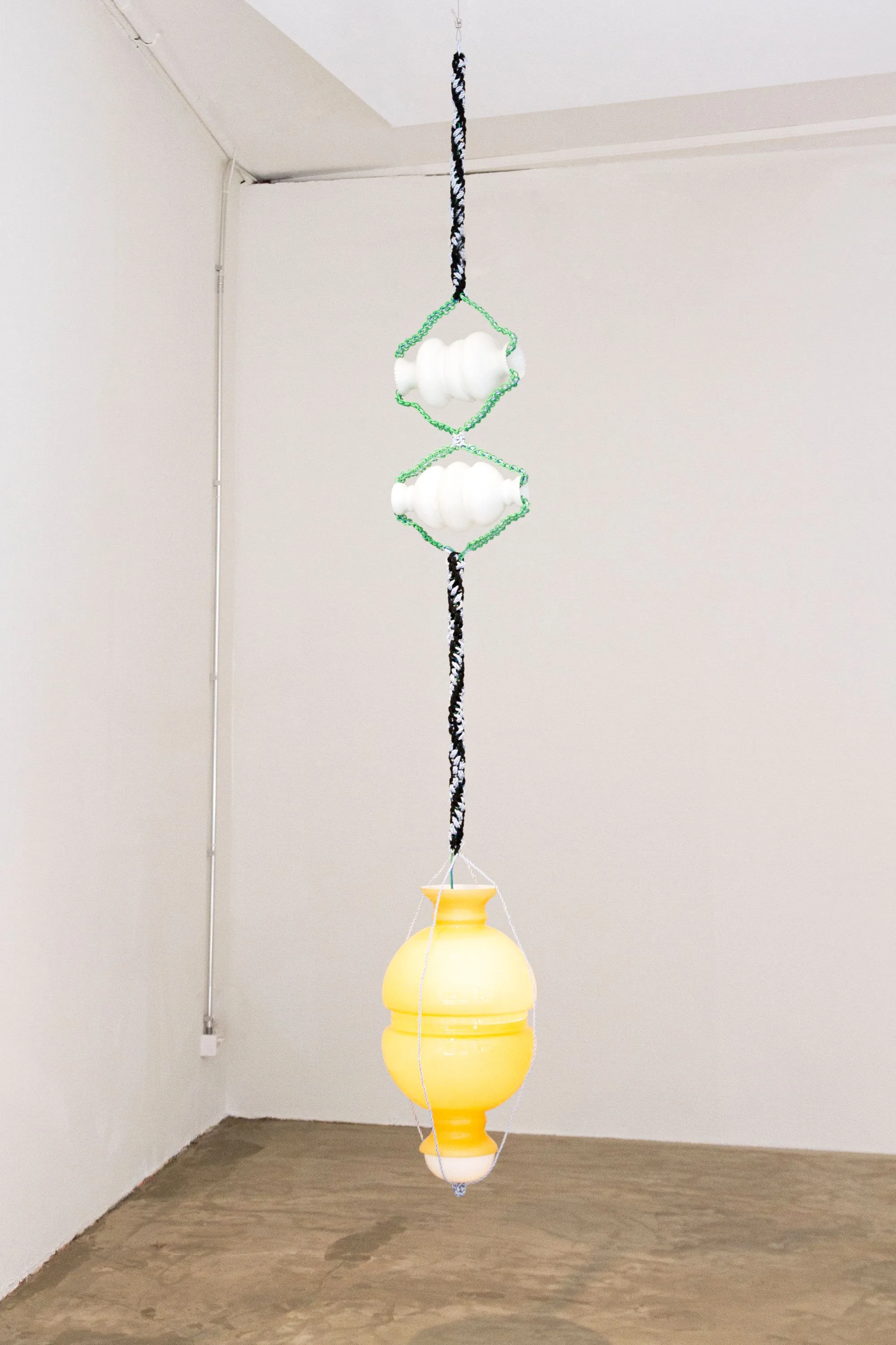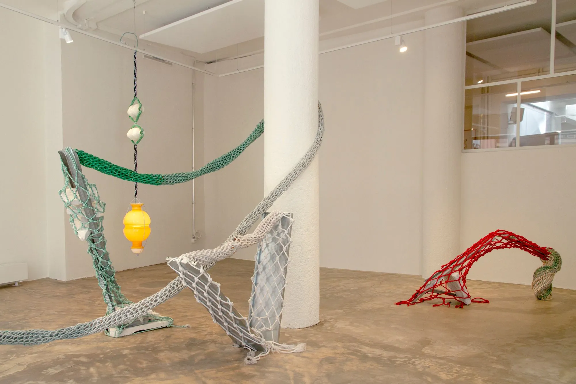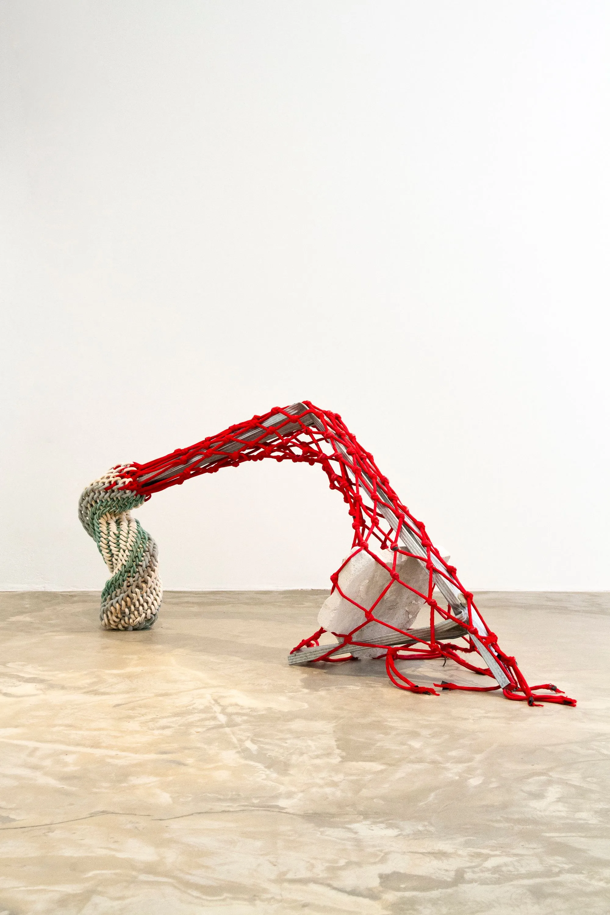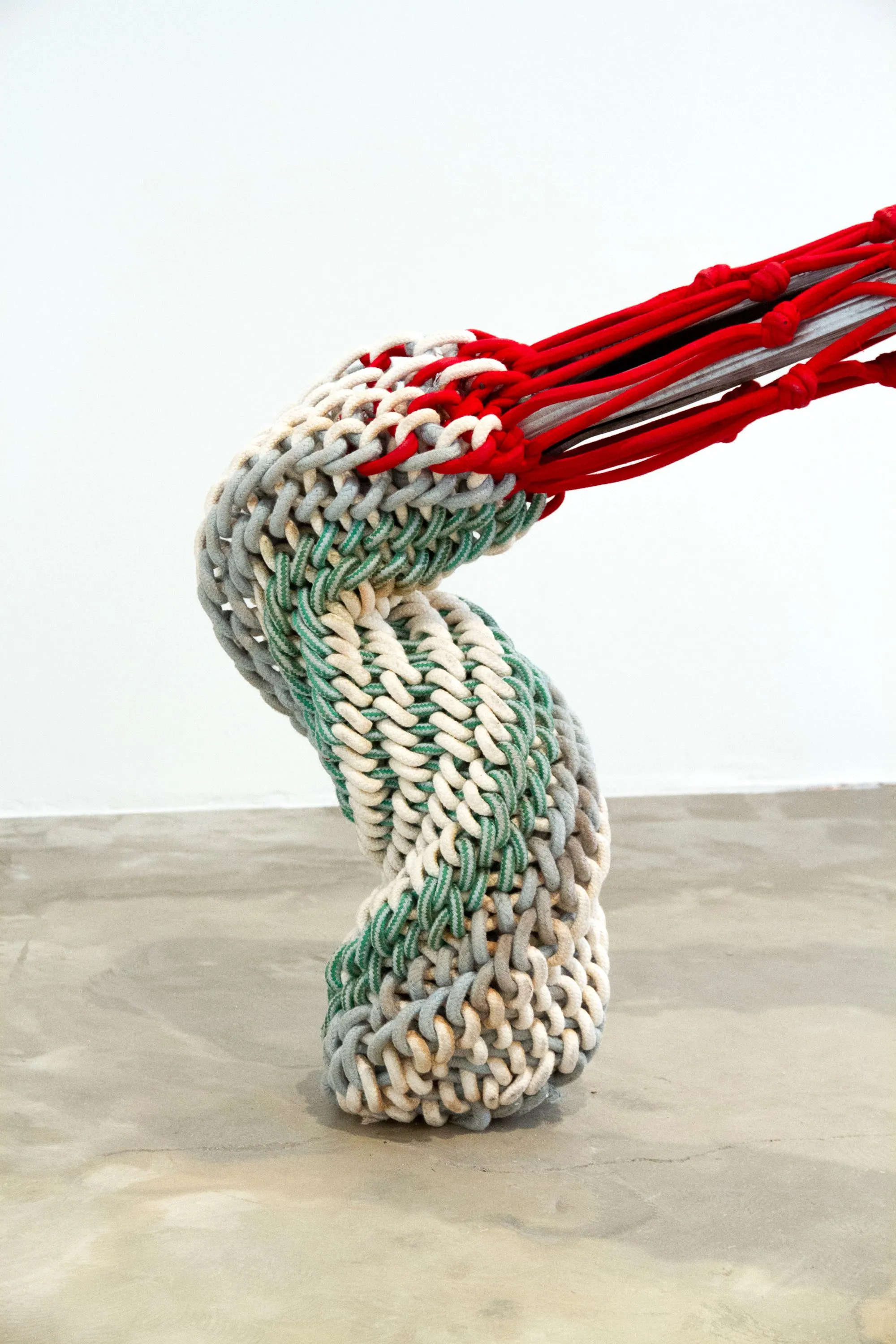 “Cordée” is a series of contextual experiments in which I employ rope-braiding techniques using surplus materials from the textile industry. For me, rope, weaving, and netting are spaces imbued with memory and color, which I intertwine and connect to fragments I find in the places where I set up. The movement inherent in my practice evokes a tension between studio and exhibition spaces, in relation to the works of Andy Goldsworthy, Gordon Matta-Clark, and Christo.