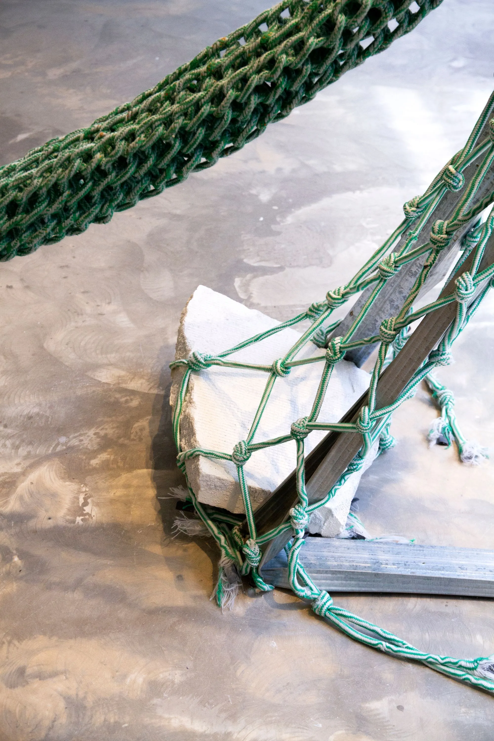 Impermanent and itinerant, the “Cordées” take root in one environment and then another, always in a different way. A play of balance—both physical and pictorial—emerges among the weaving, the net, the fragments, and the site itself. The “Cordées” deploy forces of an uncertain and ephemeral nature: subordinate to the environment in which I install them, they bend and relinquish control over the form they will take. The experience is defined by the present moment, by the story I am able to reconstruct and “re-record*” from what is already there.